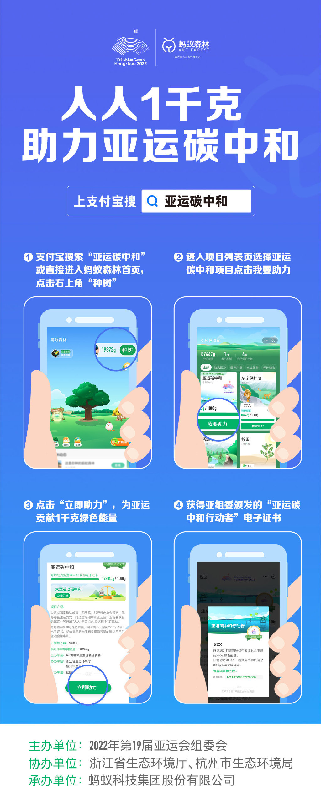 即日起至10月,在蚂蚁森林平台中,用户可以通过日常生活中的绿色出行、减纸减塑、高效节能、循环利用等绿色行为,产生并积累绿色能量后,通过捐赠的方式助力亚运会碳中和工作。